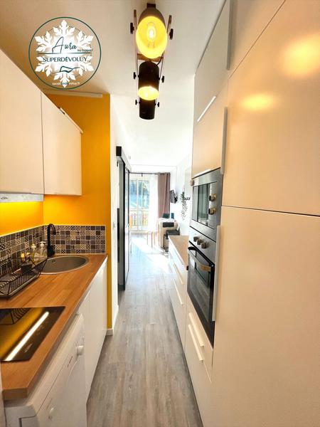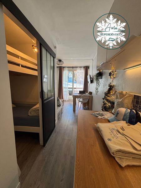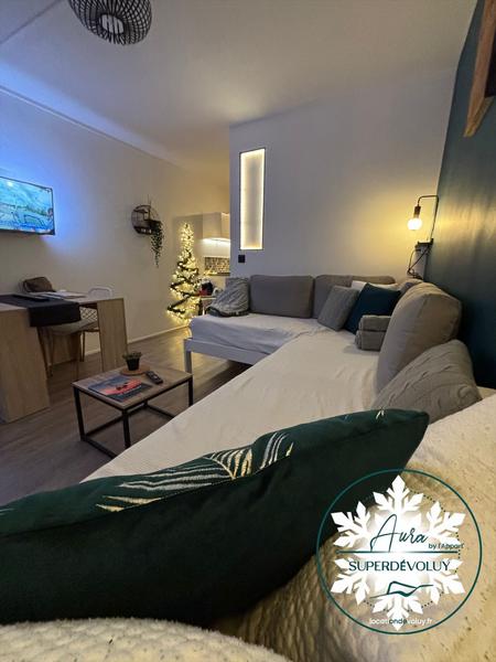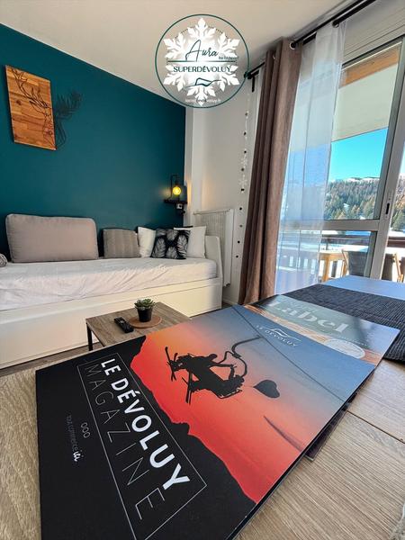 Completely renovated from floor to ceiling, Aura Dévoluy offers spaces designed with attention to every detail, state-of-the-art equipment, beautiful materials and colors, a separate bedroom, comfortable bedding, and a south-facing terrace to enjoy the exceptional panorama of the slopes and the Pic De Bure.