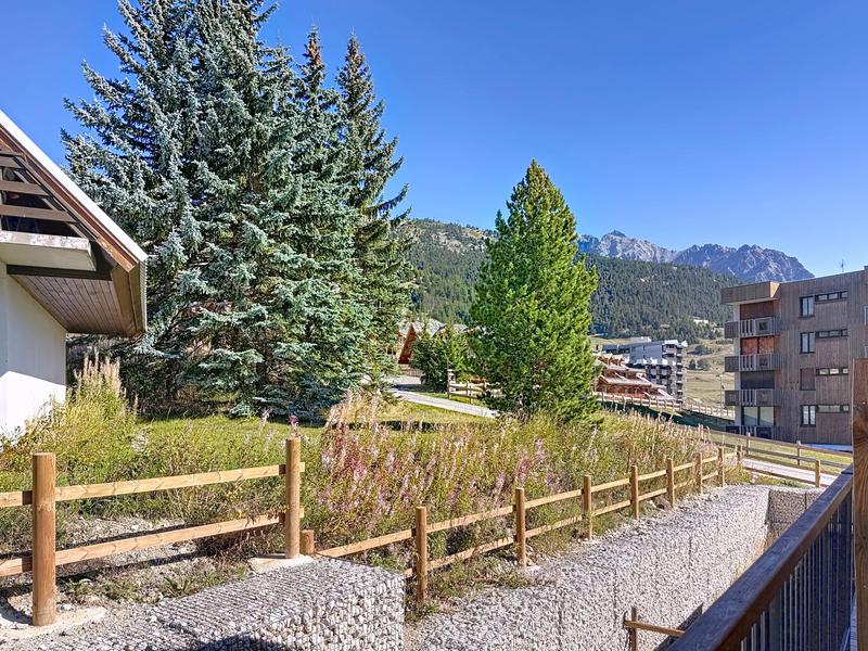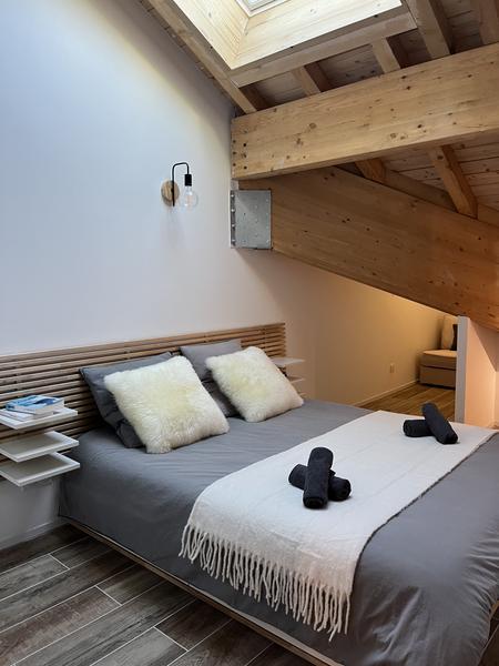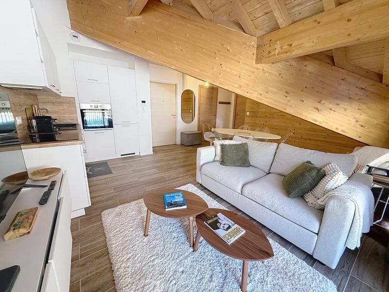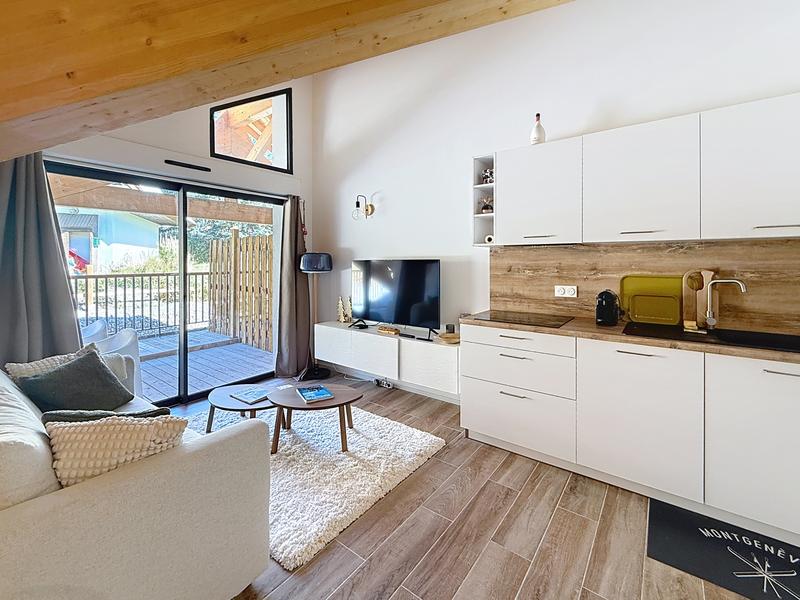 Appartement cosy de 60 m² à Montgenèvre. 2 chambres, belle charpente apparente, terrasse vue Chaberton. Wifi, cave à vin, casier à skis chauffant et garage privé. Ambiance montagne chic & haut de gamme.