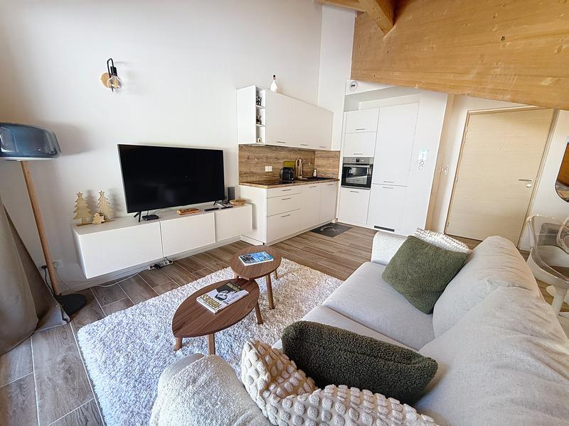 Cuisine toute équipée ouverte sur l’espace repas et le coin salon cosy.