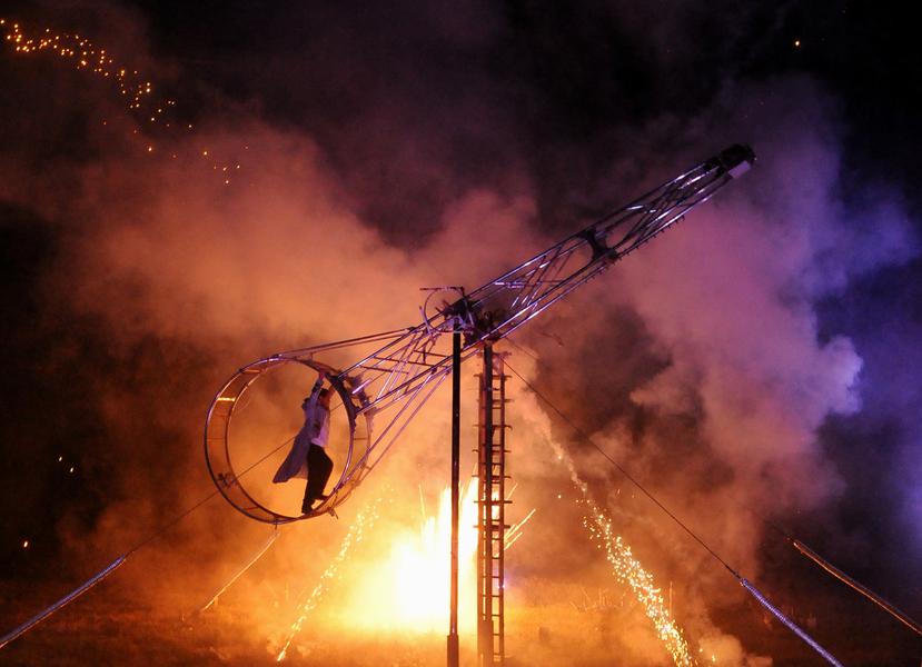 Sébastien Manach présente La Pyroue Infernale, une création où se mêlent puissance visuelle et poésie du geste. Sur un agrès monumental de 8m50, l’artiste revisite la célèbre « roue de la mort » en y intégrant des effets pyrotechniques de proximité.